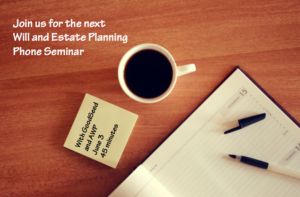 Please join us for the next Will and Estate Planning Phone Seminar designed to help you understand the critical issues of providing for your family, reducing taxes and supporting ministries of your choice.