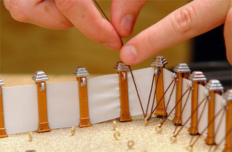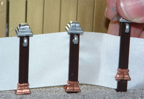 After putting the posts in, secure the brown strings around the hooks on the bottom and the hooks on the post.