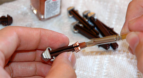 Paint the bronze base first and let it dry. Then paint the silver top and hooks.