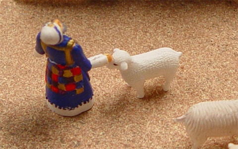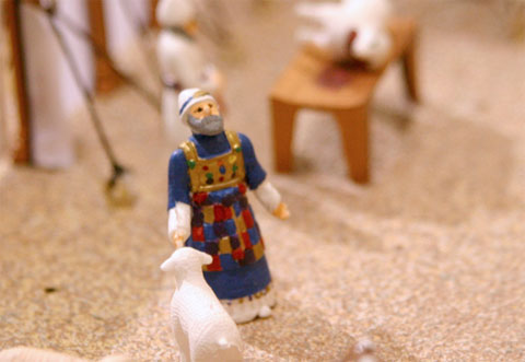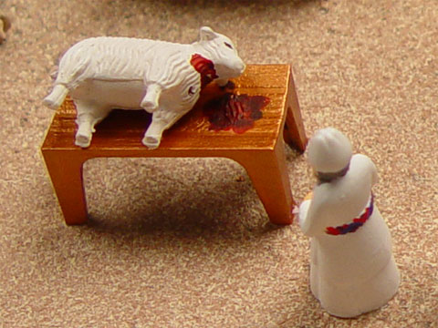 For a more realistic depiction of the sacrificial system, mix red paint with some black and apply it to a sheep across the front of its neck. Then paint the same “blood” on the table it’s resting upon.