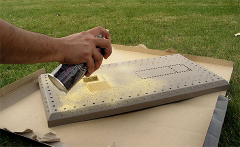 Apply a layer of texture on the top surface and the four sides of the base. Spray on enough to cover most of the plastic, but be careful not to over apply. Use a toothpick to remove any excess paint in the holes in order to avoid later problems.